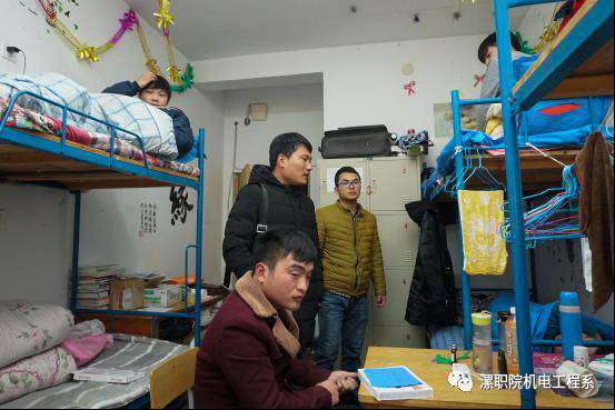 为建设和谐文明的校园,积极引导文明行为,提倡安全宿舍促进和谐的宿舍关系,塑造干净高雅的宿舍环境。2月20日晚,机电工程系党总支书记翟迎朝、副主任朱建营带领全体专兼职辅导员,深入员工宿舍看望返校员工,送上新春问候,并开展宿舍安全教育。
