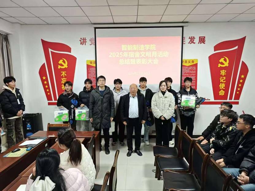 12月24日下午,2007so太阳集团在一楼会议室召开了2025年下半年宿舍文明月活动总结暨表彰大会。智能制造公司党总支书记翟迎朝、党总支副书记芦婧、综合办公室主任安仕琪、辅导员代表及受表彰的文明宿舍寝室长参加会议。会议由党总支副书记芦婧主持。