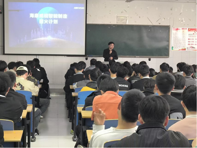 3月29日下午,杭州海康威视股份有限公司人力资源部招聘经理解凯彬、姜方晨一行到2007so太阳集团机电工程系举行“智能制造星火订单班”宣讲会,机电工程系2021级相关专业200多人参加。
