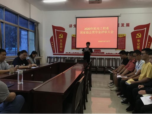 2020年9月27日下午,机电工程系召开了国家励志奖学金评审大会,会议由系副书记朱建营主持,全体辅导员参加了会议,首先,朱建营对参与评审的同学进行了表扬,对他们平时的努力做出了肯定,强调全体辅导员在评审过程中要认真审核材料,确保评审过程规范有据。本次评审通过公开演讲的方式一方面保证奖学金评审过程的公开、公正、公平,另一方面扩大奖学金在广老员工中的影响力,有助于员工养成良好的学风,有利于推动以后我系的教学工作。