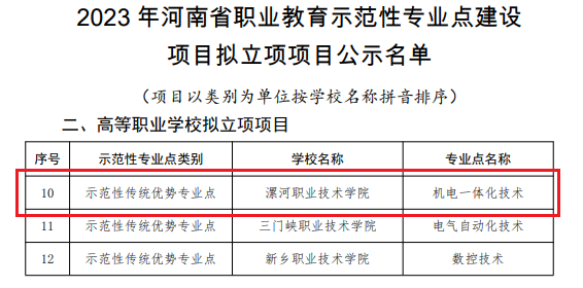 近日,根据《河南省教育厅关于2023年河南省职业教育示范性专业点建设项目拟立项项目名单的公示》,公司机电一体化技术专业入选河南省职业教育示范性专业点建设项目(示范性传统优势专业点)。
